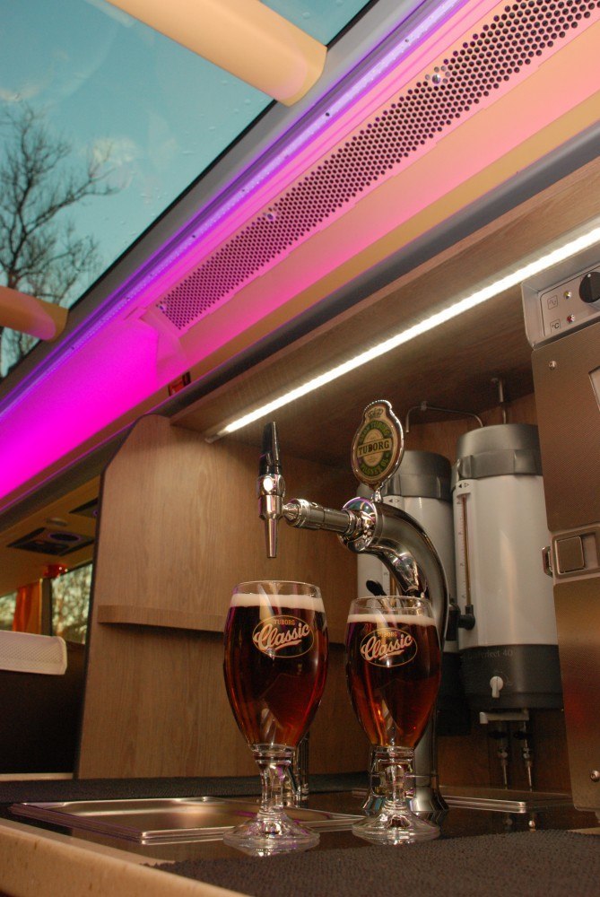 I løbet af få minutter kan vores VIP bus forvandle sig til jeres eventarena. Produktpræsentationer bliver en leg med kolde drikke og komfortable lædersæder. Tilpas sæderne med nakkeskånere trykt med jeres logo, og gør bussen til jeres brandikon.